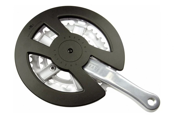 De eerste vrijwel onbreekbare universele ronde behuizing met een modern design.Details: Nieuw bevestigingssysteem van versterkt glasvezel dat in de crankas kan worden geschroefd. Geschikt voor krukassen met inwendige schroefdraad. De behuizing komt niet in contact met de plaat. Gemakkelijk te monteren en te demonteren met centrale schroef. Voor kettingbladen tot 48 tanden. Afmetingen: 21x21cm Gewicht: 90g