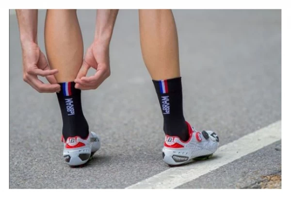LeBram vervolledigt zijn gamma technisch textiel met een collectie sokken ontworpen voor wielrenners. Deze hoge sokken van LeBram zijn een eerbetoon aan de Aravis-pas, welbekend bij klimmers en liefhebbers van het buitenleven. Ze hebben een driekleurig vlaggetje op de achterkant ter ere van de Franse productie en zijn verkrijgbaar in 3 kleuren, zodat u uw outfit in alle omstandigheden kunt matchen.Ontworpen in een technisch materiaal, voert dit paar sokken transpiratie snel af om uw voeten droog te houden en geeft u zeer goede ondersteuning tijdens uw weg- en/of mountainbiketochten.Dit paar sokken is ideaal om uw LeBram outfit compleet te maken!Details