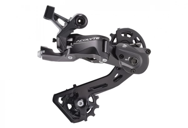 The heart of the Acolyte derailleur is our innovative SpringLock system. By combining a custom linear rate high tension spring and a two-stage activation mechanism, we have developed a system that can keep the chain safe when you need it and deactivate it when you don't. need. To engage the clutch, turn the engagement bolt clockwise until it clicks into place. It is impossible to overtighten the bolt. To disengage the clutch in order to remove the wheel, simply activate the switch. It's as simple as that. Characteristics Speed: 8 Speed Material: Steel screed, Max Teeth: 42-46T Capacity: 41 Teeth Derailleur clutch Clevis lengths: Medium