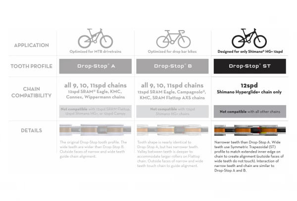 Drop-Stop ST tandprofiel voor gebruik met Shimano 12-speed HyperGlide+ kettingen.