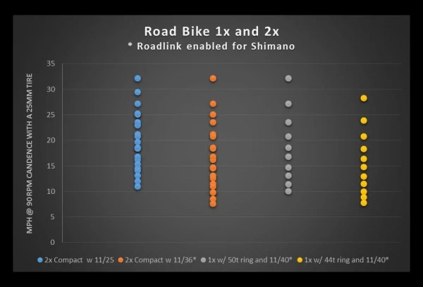 De RoadLink is geoptimaliseerd voor Shimano 10 en 11 speed wegderailleur geometrie, maar werkt ook goed met 9 speed wegderailleurs. Traditionele Sram derailleurs werken, maar niet de specifieke X-Horizon 1x achterderailleurs. Campagnolo achterderailleurs werken het best met cassettes tot 11-36 tanden.